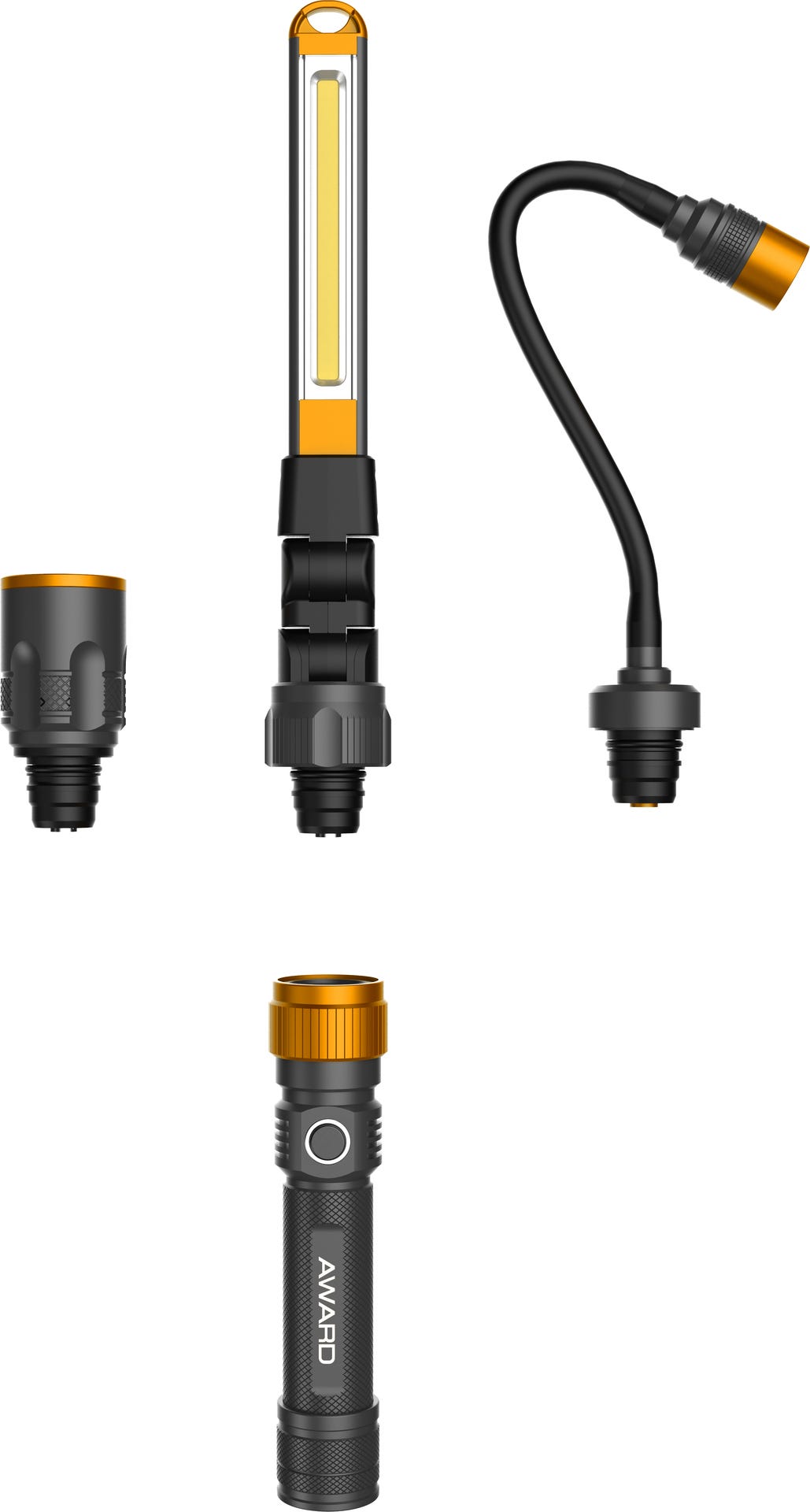 Modulaarinen tarkastusvalo kolmella vaihtopäällä: joustava varsi, työvalo ja taskulamppu.