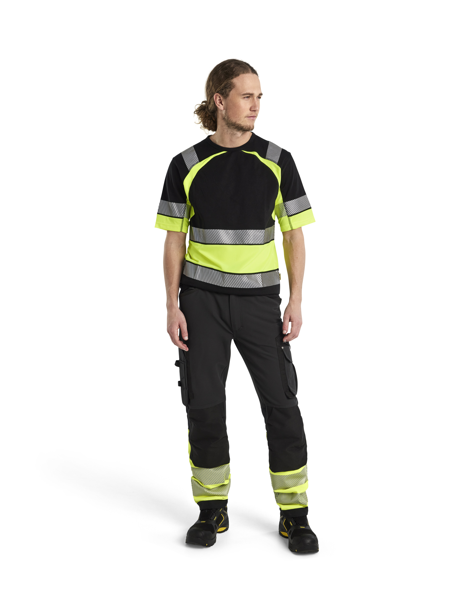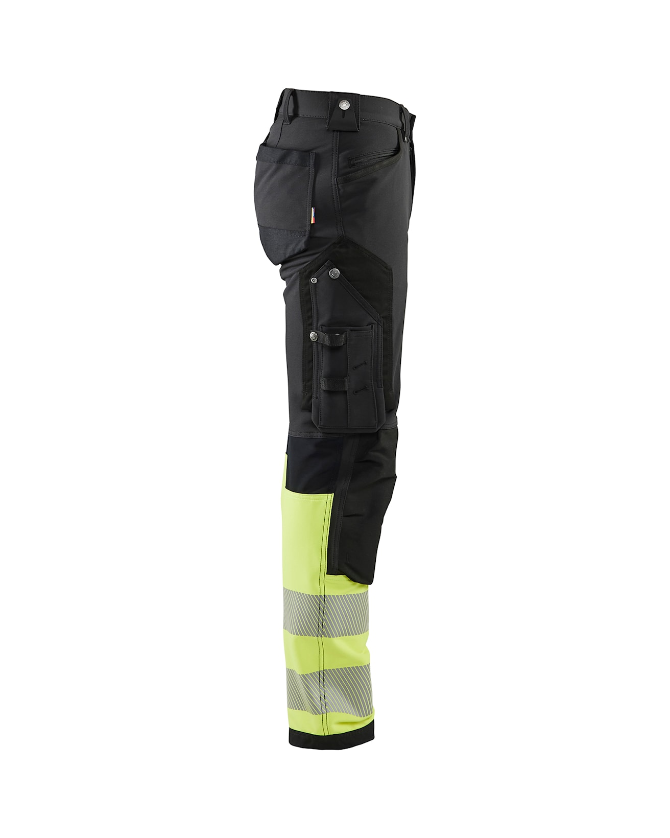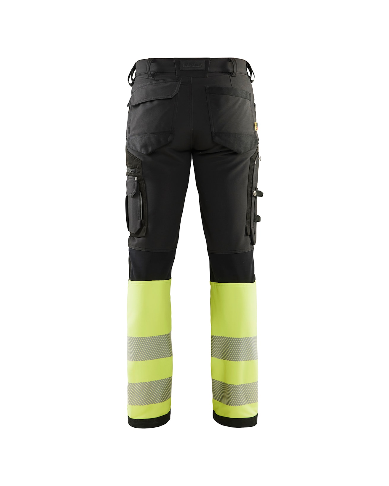 Erittäin mukavat ja toiminnalliset highvis housut 4 suuntaan joustavasta kankaasta. Lahkeet on kapenevat ja erittäin mukavat joustavan ja pehmeän kankaan ansiosta. Housussa on erittäin toiminnalliset taskut CORDURA®-vahvistuksilla, vetoketjullinen paljereisitasku, mittatasku ja etutaskut. Polvisuojataskut on vahvistettu joustavalla CORDURA®-kankaalla ulkopuolelta ja sisäpuoli on stretch-kangasta liikkuvuuden ja mukavuuden lisäämiseksi. Joustava verkkokangas polvitaipeissa lisää hengittävyyttä. Lahkeensuut on vahvistettu takapuolelta kulumisen estämiseksi. Sertifioitu EN 20471 luokka 1.