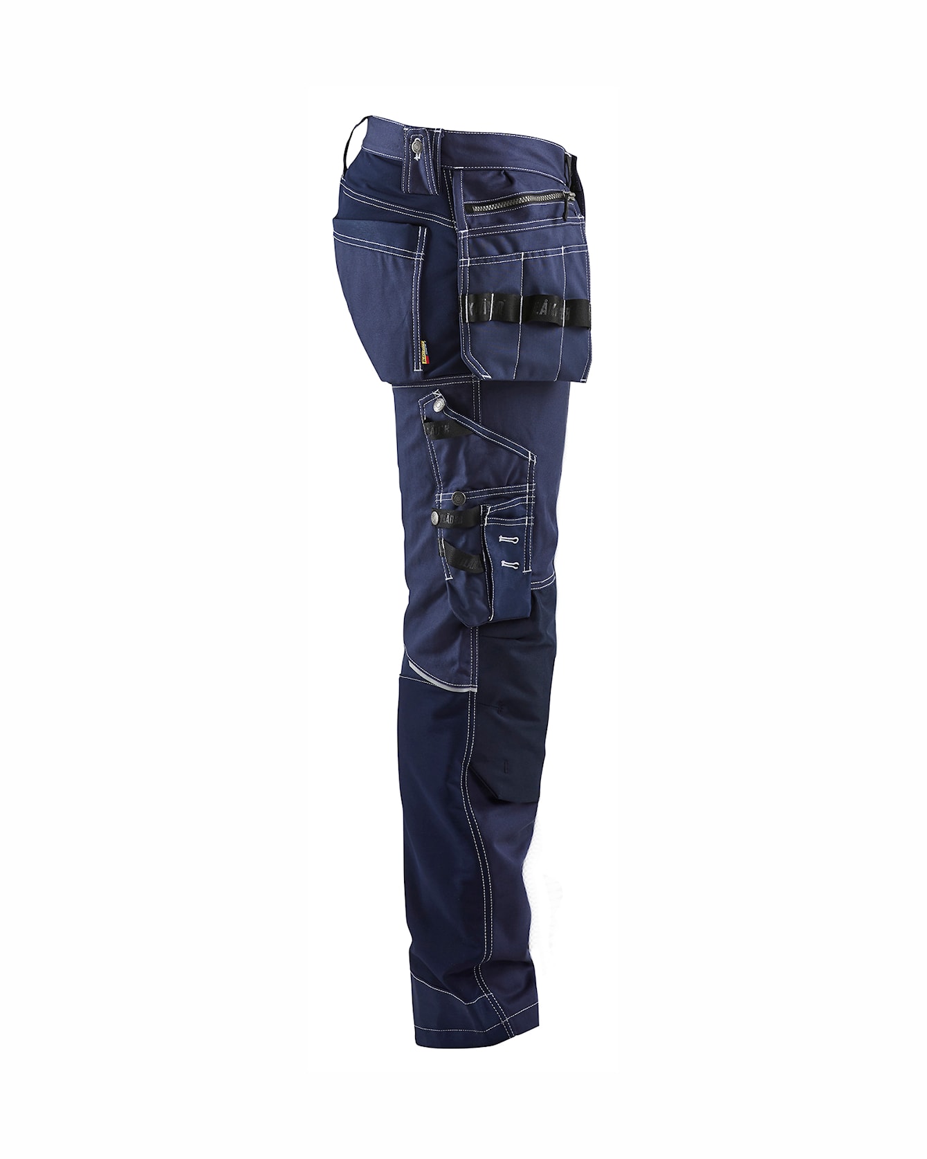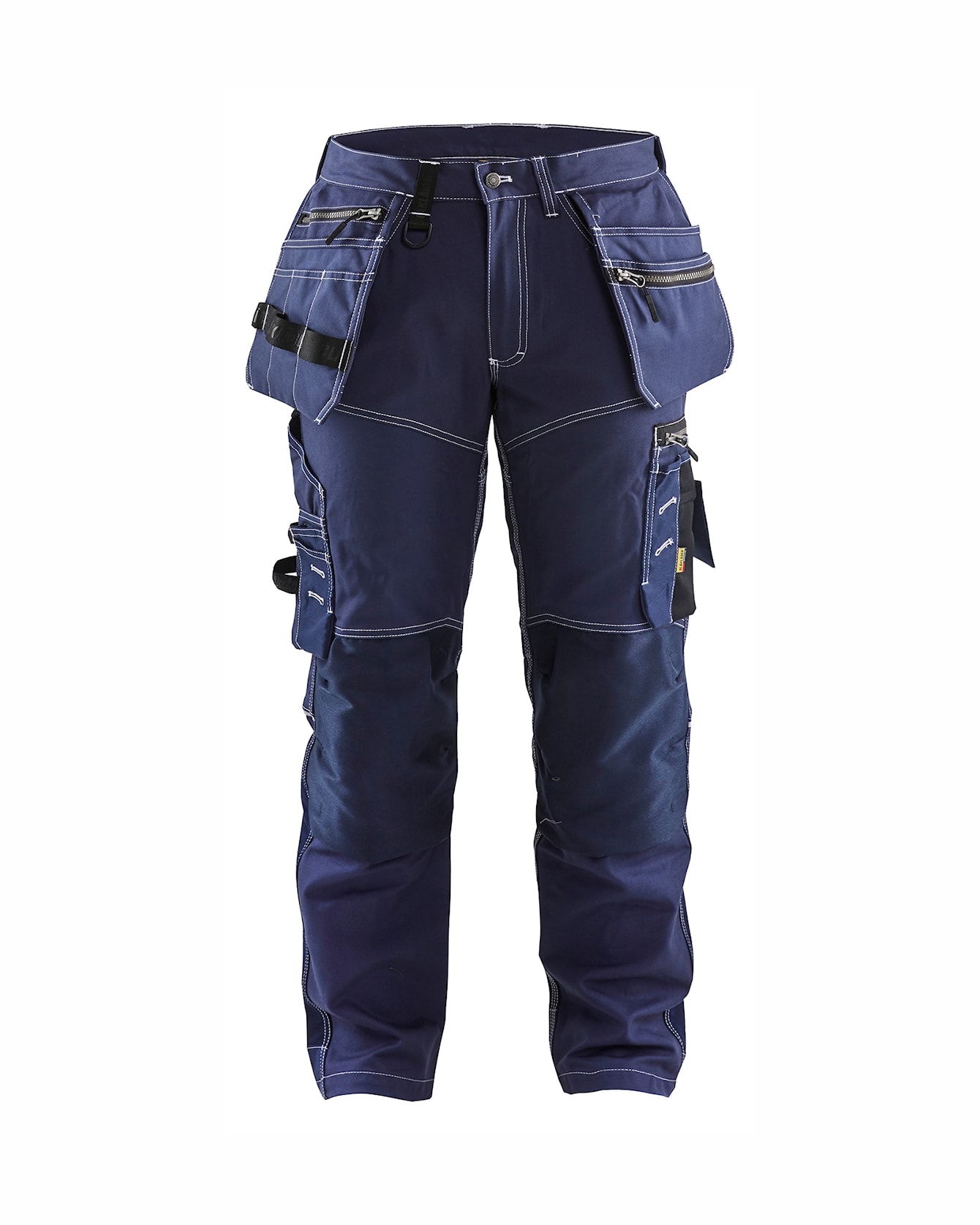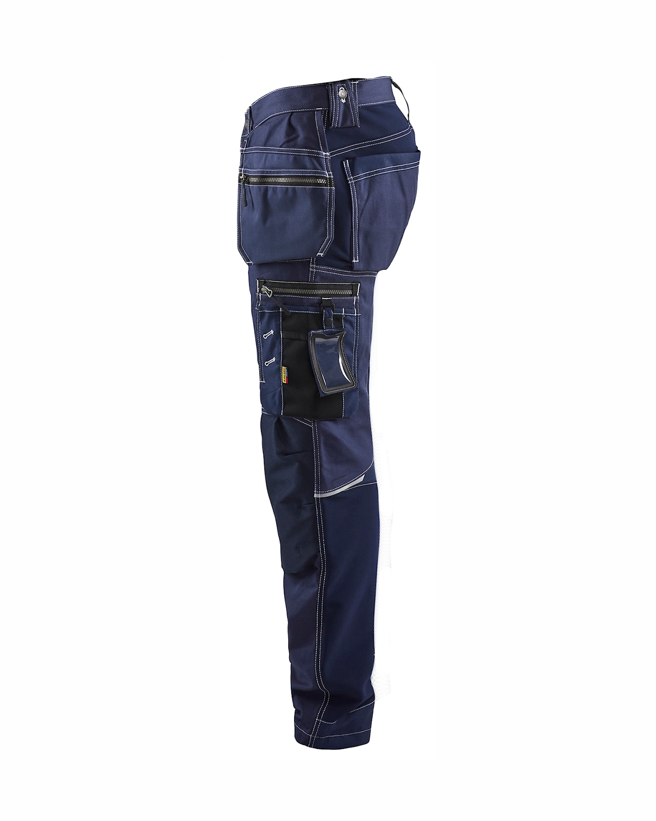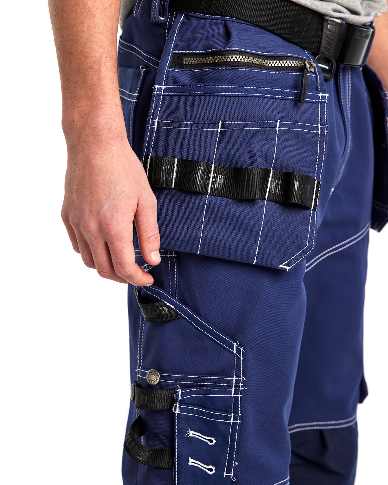 Kestävät ja mukavat puuvillaiset riipputaskuhousut käytännöllisillä yksityiskohdilla, jotka helpottavat työntekoa. Housuissa on kapea istuvuus ja tukevasta kankaastaan huolimatta, housut ovat ilmavat ja tuntuvat mukavilta päällä. 4 suuntaan joustavat osiot takana, vyötäröllä, pohkeissa ja taskujen aukoissa sekä CORDURA® Stretch -vahvistetut polvisuojataskut lisäävät mukavuutta.