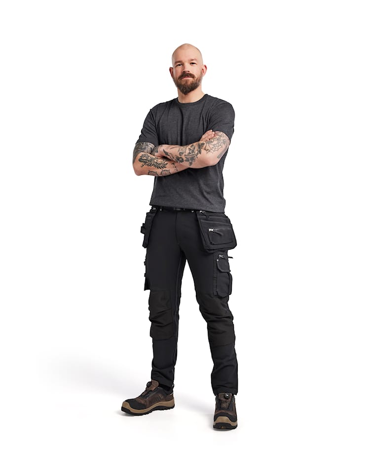 Erittäin mukavat ja toiminnalliset riipputaskuhousut 4 suuntaan joustavasta kankaasta. Lahkeet on kapenevat ja erittäin mukavat joustavan ja pehmeän kankaan ansiosta. Housussa on toiminnalliset taskut vahvistuksilla, vetoketjullinen paljereisitasku, mittatasku ja riipputaskut kätevillä työkalulenkeillä. Polvisuojataskut on vahvistettu joustavalla CORDURA®-kankaalla ulkopuolelta ja sisäpuoli on stretch-kangasta liikkuvuuden ja mukavuuden lisäämiseksi.