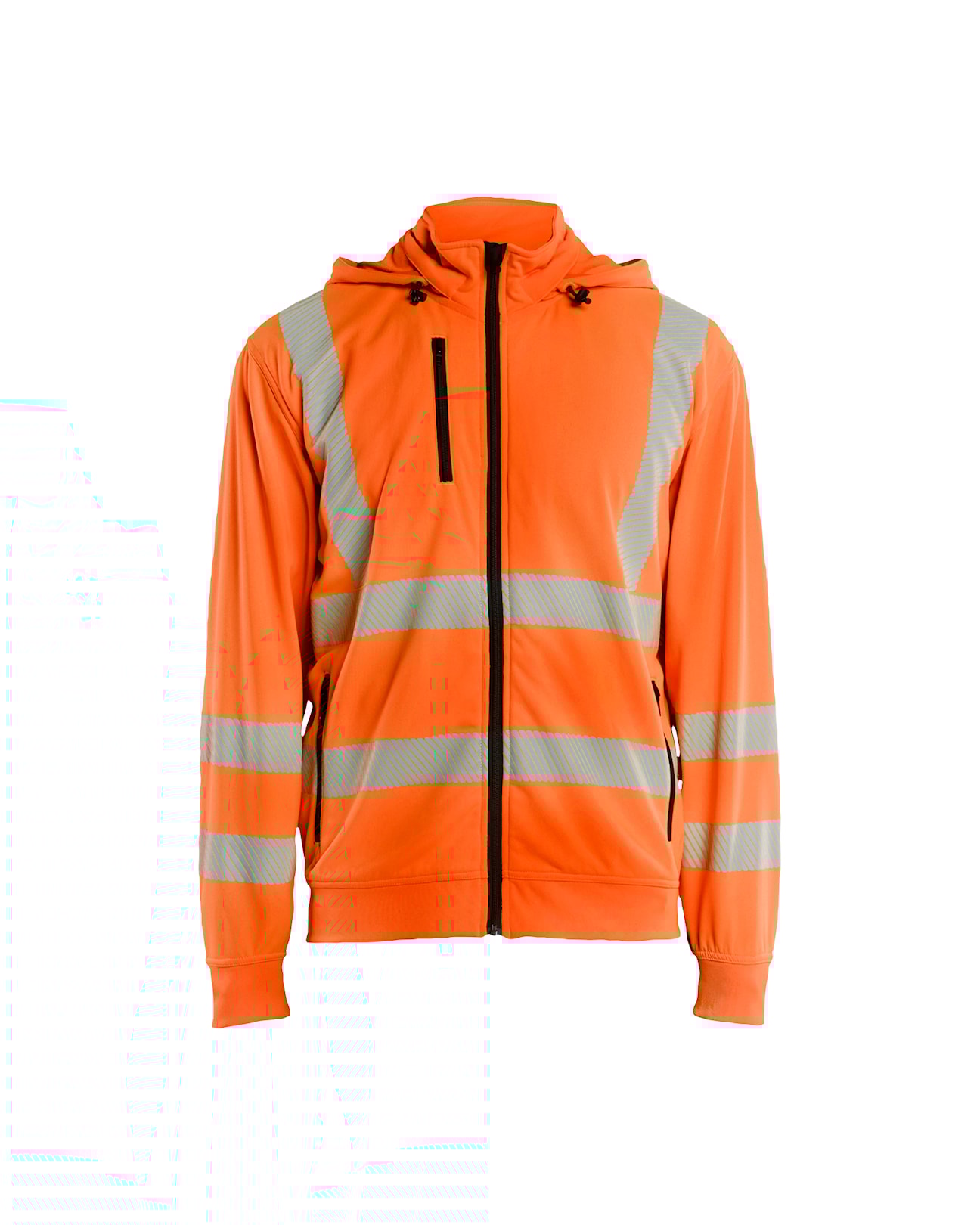 Highvis huppari katkonaisilla heijastimilla näkyvyyden lisäämiseksi. Pehmeää ja mukavaa fleecekangasta sisäpuolella. Irrotettava huppu, korkea kaulus, vetoketju edessä, etutaskut, rintatasku ja resorit hihansuissa. Kestää teollisuuspesun.