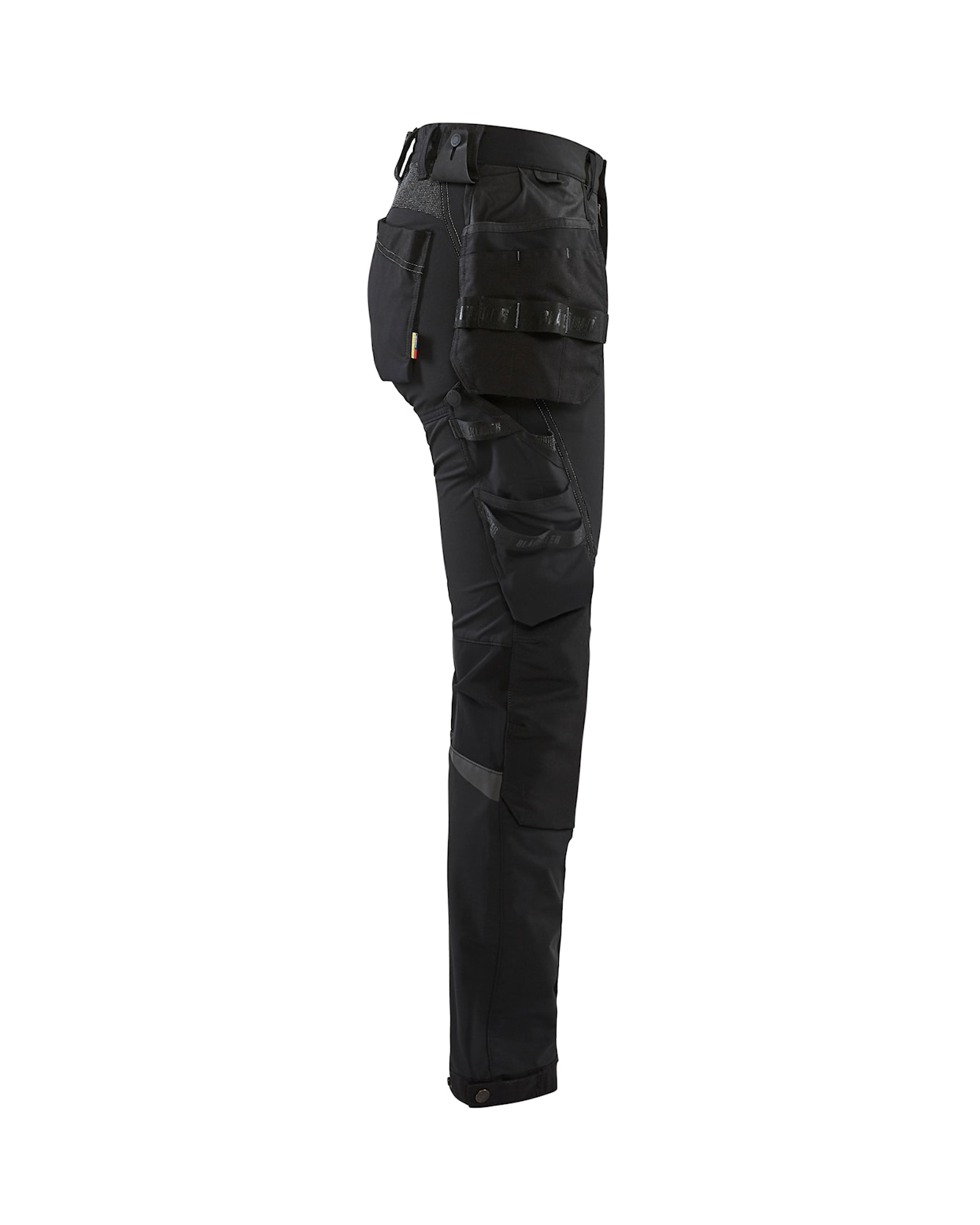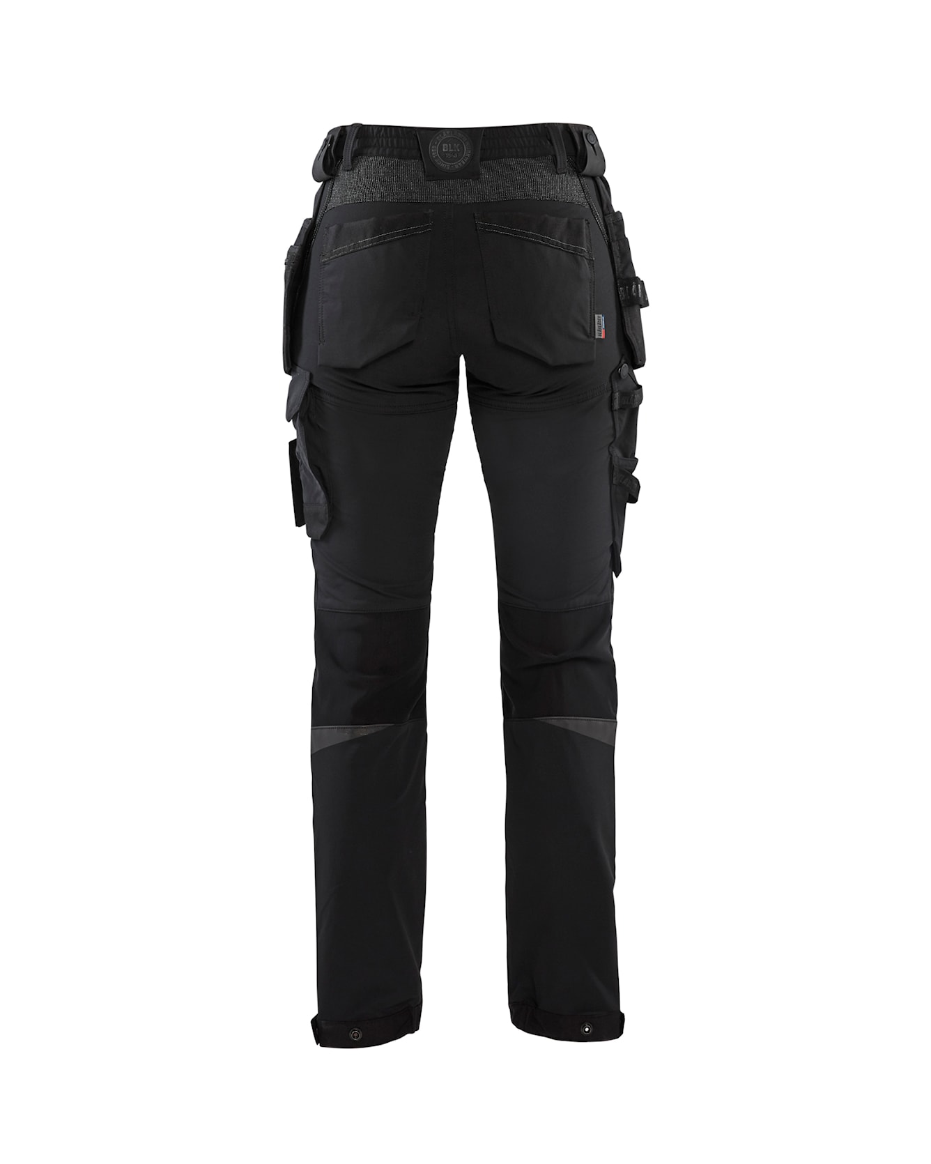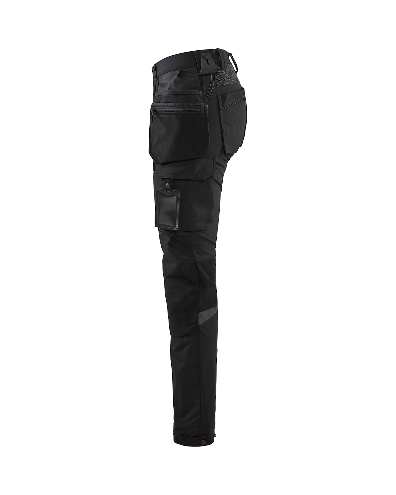 Kevyet ja erittäin mukavat naisten riipputaskuhousut neljään suuntaan joustavalla stretchillä. Kapeampi ja hieman tiukempi malli, joka miellyttää monia käyttäjiä. Joustava vyötärö antaa lisämukavuutta. Joustavat polvisuojataskut, riipputaskut, joista toinen vetoketjulla, palkeelliset takataskut, mittatasku ja vasaralenkki. Pehmeä ja joustava verkkomateriaali polvitaipeissa tuo hyvää ilmanvaihtoa ja takaosasta vahvistetut lahkeensuut kestävät kulutusta.