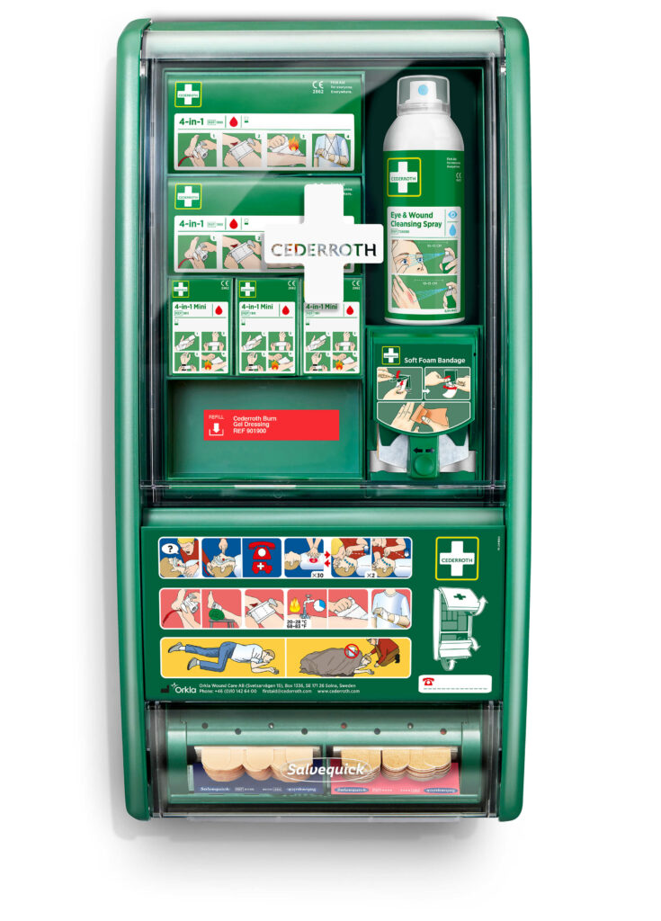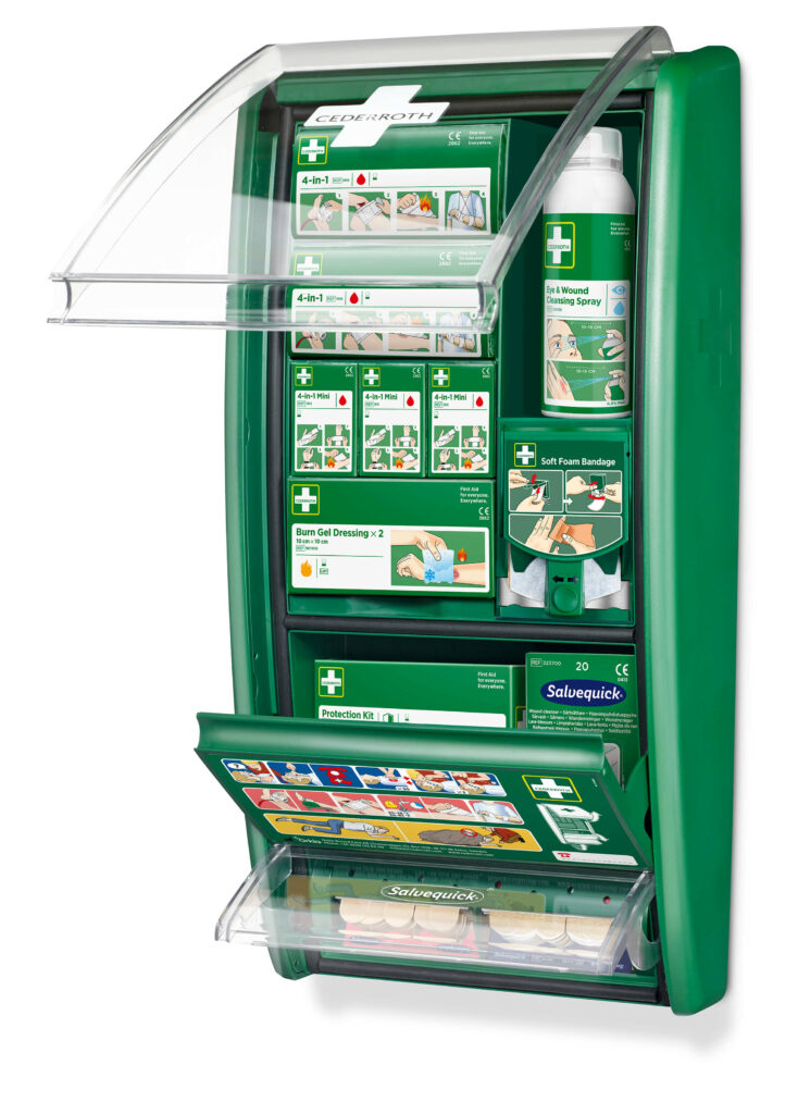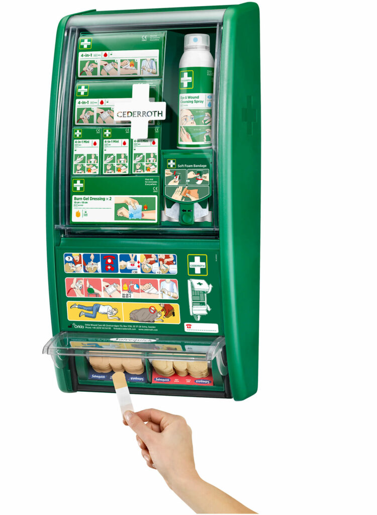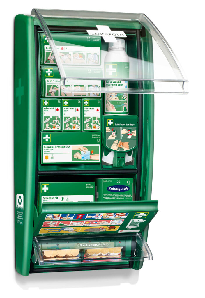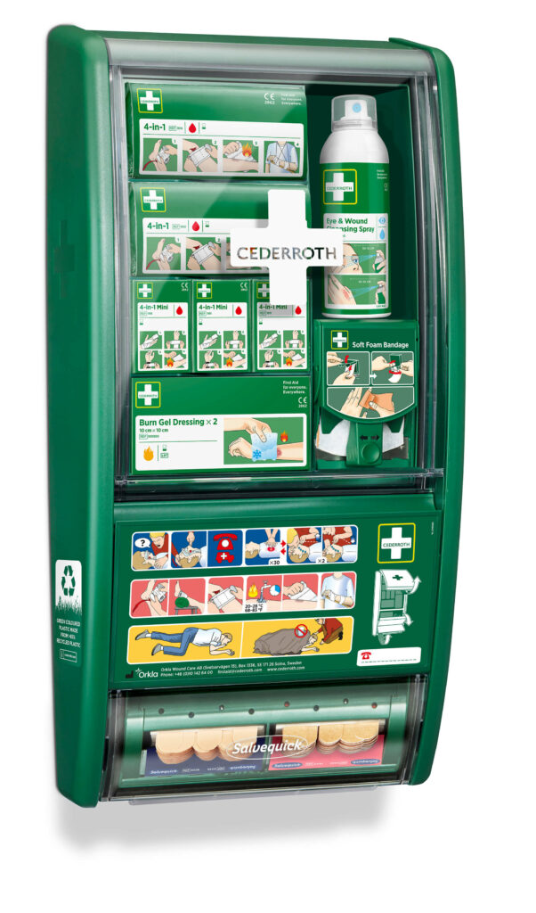 Ensiapuaseman myötä voidaan hoitaa erilaisia vammoja ja tarvittaessa mukauttaa aseman sisältöä erilaisiin hoitotarpeisiin. Toiveemme on, että monipuolisten ensiaputarvikkeiden avulla yhä useampi voi antaa ensiapua työpaikalla. Sisältää enemmän tuotteita pienten haavojen hoitoon, jotka aiheuttavat suurimman osan vammoista työpaikalla. Entistä paremmin varusteltuna, nyt integroidulla Soft -laastariannostelijalla. Soft-laastari on joustava, muotoiltava, liimaton ja itsekiinnittyvä laastari, antaen maksimaalisen liikkuvuuden. Laastari sopii kaikenlaisiin pieniin haavoihin ja pysyy paikoillaan jopa vedessä. Soft- laastariannostelijan integroitu leikkuuterä helpottaa käyttöä ja saat laastaria aina tarvittavan määrän. Täyttöpakkauksia saatavana kahdessa eri värissä: sininen tai beige. Vuodesta 2022 lähtien ensiapuasemien vihreä muovi on valmistettu 85 % kierrätysmuovista, joka tuottaa 90 % vähemmän hiilidioksidipäästöjä kuin neitseellinen muovi.