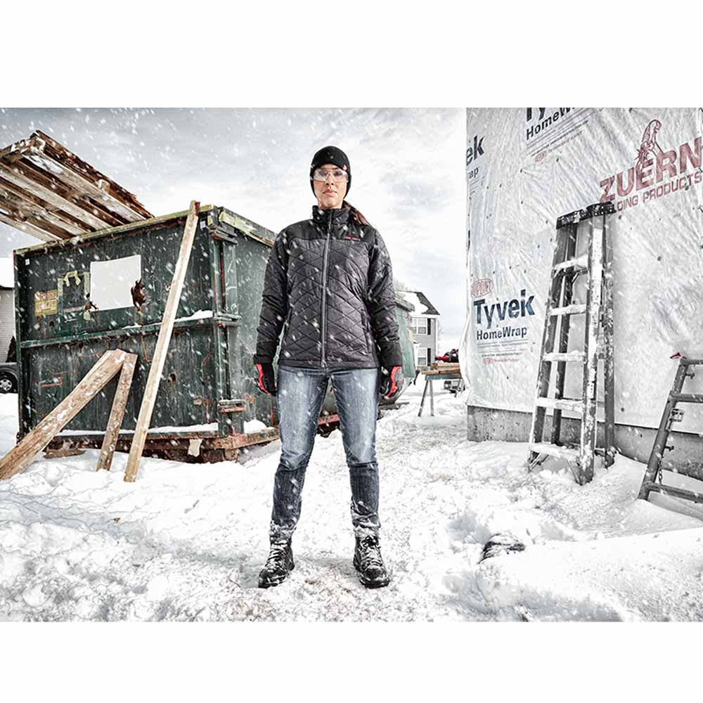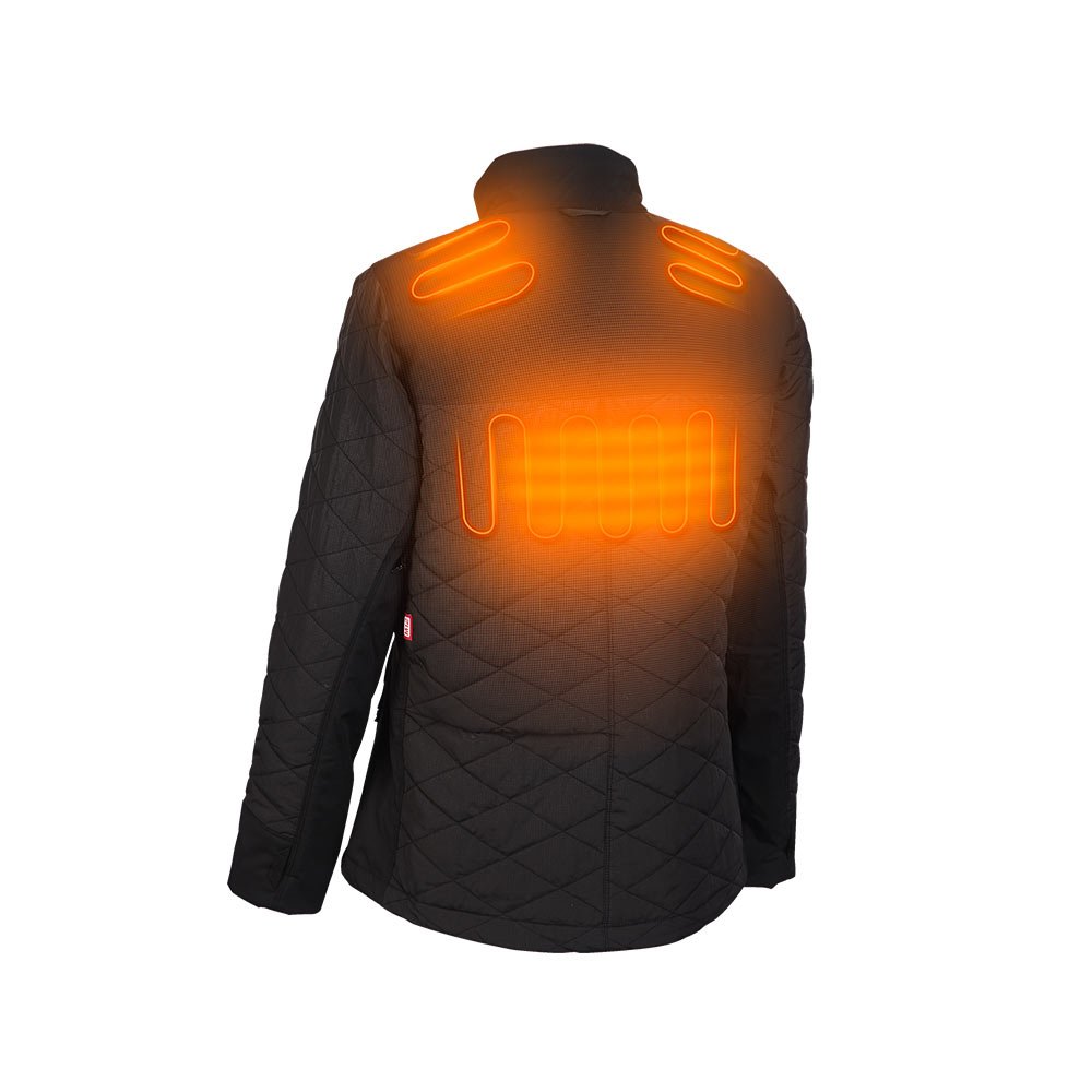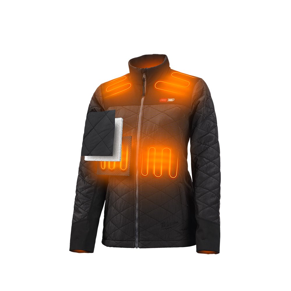 - M12™ REDLITHIUM™-akkuteknologialla toimiva tikattu hybridilämpötakki hyödyntää hiilikuitulämmitystä, joka jakaa lämmön tasaisesti rintakehän ja selkään