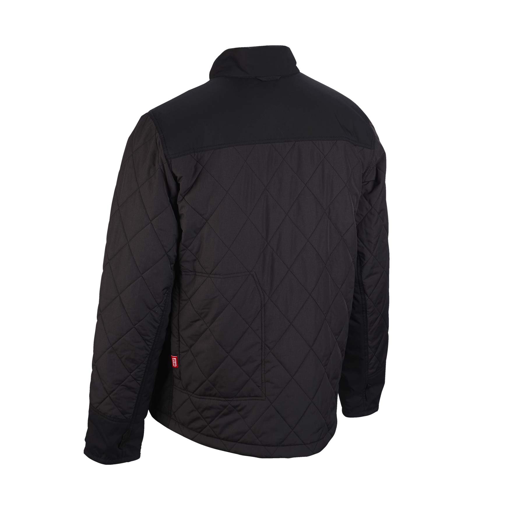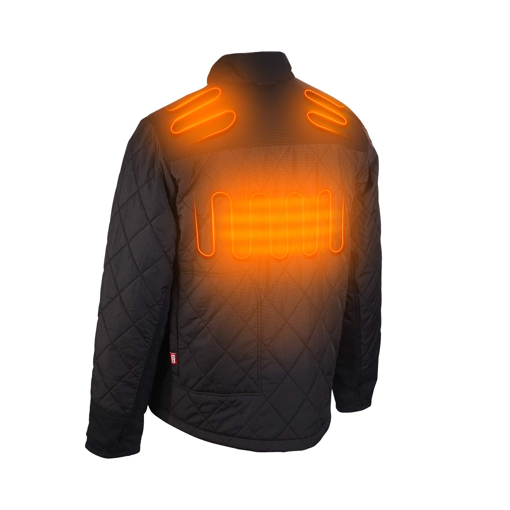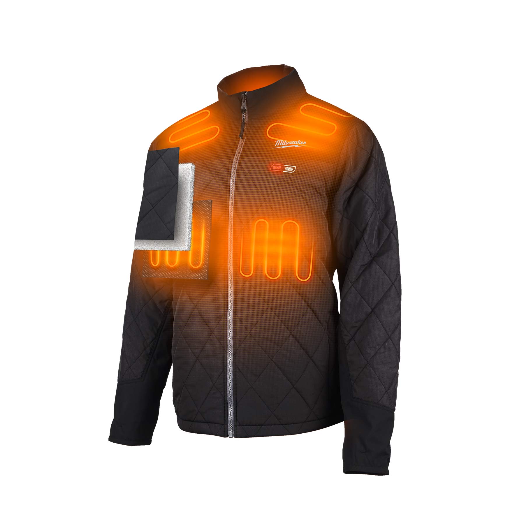 - M12™ REDLITHIUM™ -akkuteknologialla toimiva tikattu hybridilämpötakki hyödyntää hiilikuitulämmitystä, joka jakaa lämmön tasaisesti rintäkehään, selkään ja olkapäihin