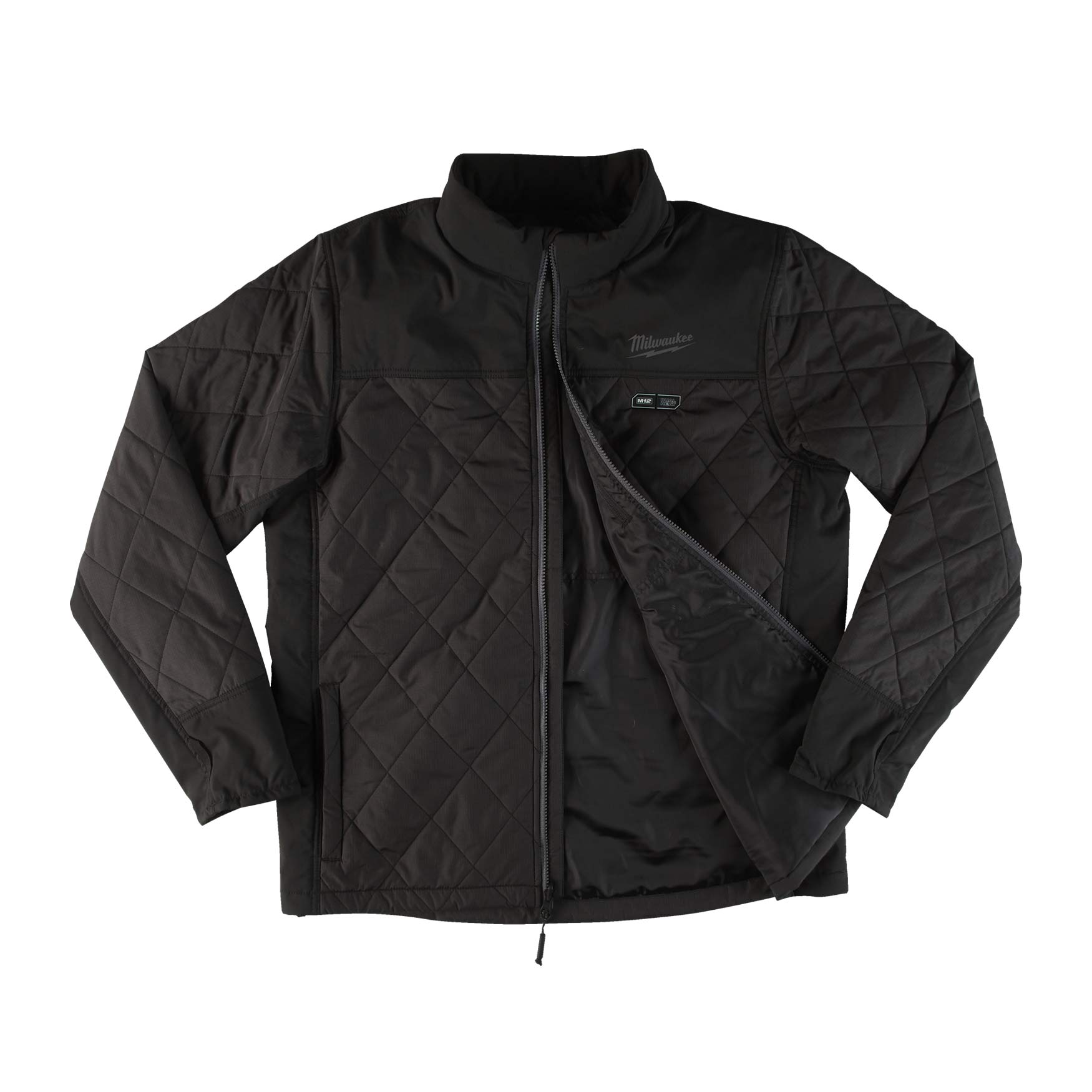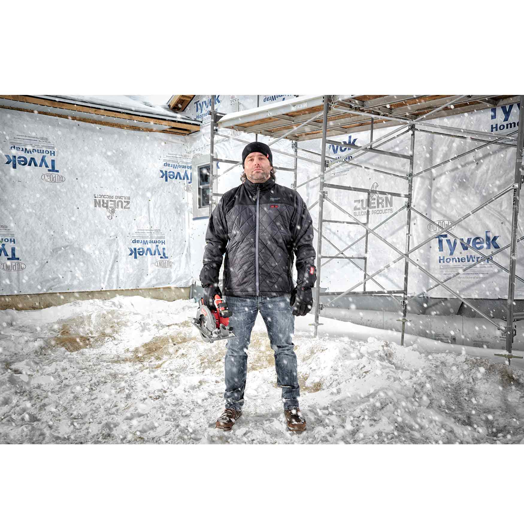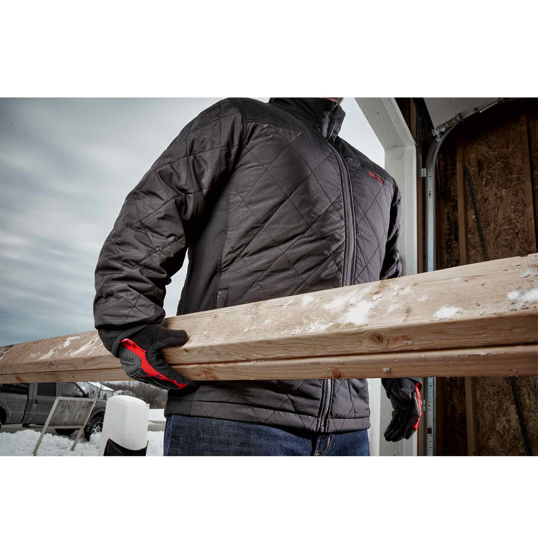 - M12™ REDLITHIUM™ -akkuteknologialla toimiva tikattu hybridilämpötakki hyödyntää hiilikuitulämmitystä, joka jakaa lämmön tasaisesti rintäkehään, selkään ja olkapäihin