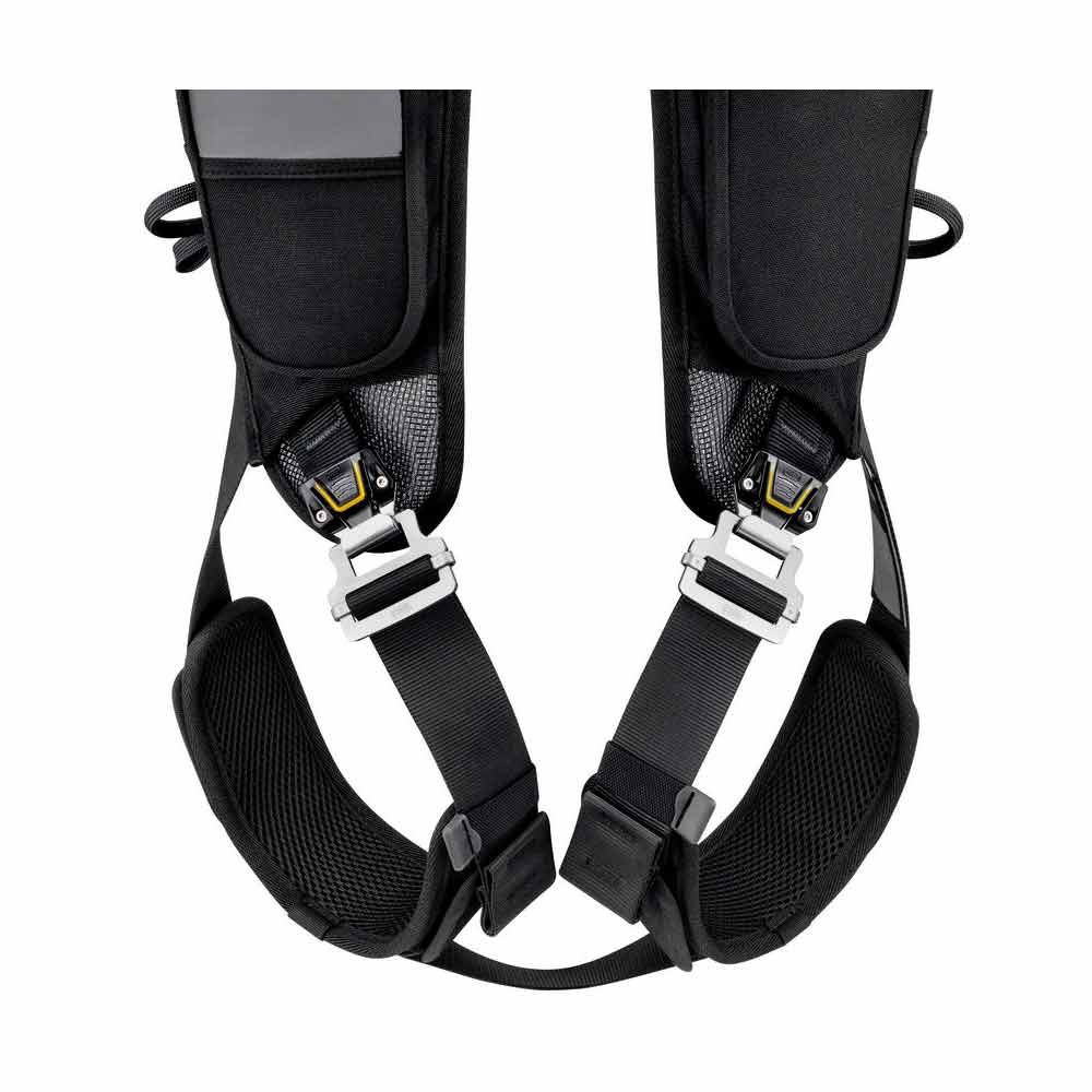 Leveästi sijoitetut pehmustetut olkahihnat vähentävät niskan hankausta, ja valjas mahdollistaa LIFT‑laskeutumissovittimen kiinnityksen pystyasennossa laskeutumista varten. Käytännöllisyyttä lisäävät kaksi vetoketjullista taskua sekä irrotettavat reisilenkkien pehmusteet. FAST LT ‑pikalukot jalkalenkeissä ja FAST LT PLUS ‑rintalukko tekevät pukemisesta nopeaa ja vaivatonta myös käsineet kädessä, ja DOUBLEBACK‑soljet takaavat helpon säädettävyyden.