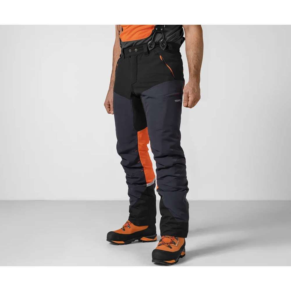 Husqvarna Technical Robust -turvahousut tarjoavat erinomaista mukavuutta ja kestävyyttä ykkösluokan sahasuojalla pitkiin metsätyöpäiviin vaativassa ympäristössä. Verkkokankaan ja monien vetoketjujen ansiosta housut ovat todella hengittävät. Housujen etuosa ja haarakiila on valmistettu erittäin kestävästä Dyneema®-kankaasta ja vyölenkit sekä lahkeen alaosa on vahvistettu vielä Cordura®-materiaalilla, joten housut ovat äärimmäisen kestävät. Punkkisuoja nilkkojen ympärillä ja neljään suuntaan joustava kangas takaosassa lisäävät käyttömukavuutta, jotta jaksaisit olla parhaassa terässä koko työpäivän ajan.
